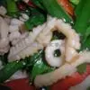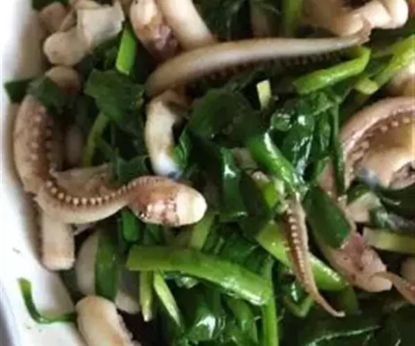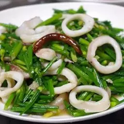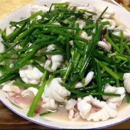 11. 放入韭菜翻炒1分钟后,将鱿鱼倒入再炒30秒;