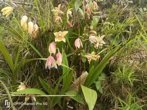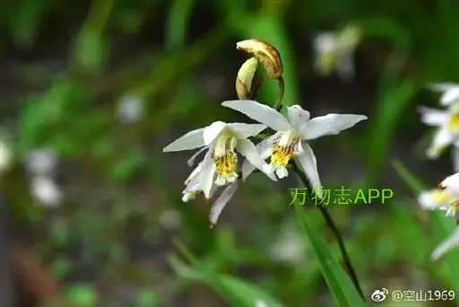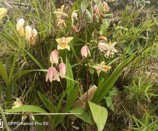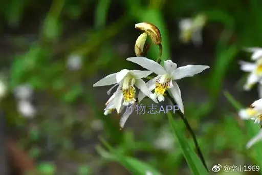 黄花白及(学名:Bletilla ochracea Schltr.):草本植物,植株高25-55厘米。假鳞茎扁斜卵形,较大,上面具荸荠似的环带,富粘性。茎较粗壮,常具4枚叶。叶长圆状披针形,先端渐尖或急尖,基部收狭成鞘并抱茎。花序具3-8朵花,通常不分枝或极罕分枝;花中等大,黄色或萼片和花瓣外侧黄绿色,内面黄白色,罕近白色;萼片和花瓣近等长,长圆形,唇瓣椭圆形,白色或淡黄色。花期6-7月。