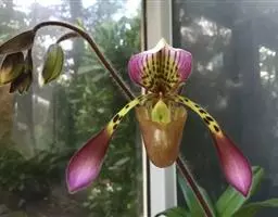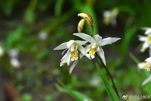 花序具3-8朵花,通常不分枝或极罕分枝;花序轴或多或少呈“之”字状折曲;花苞片长圆状披针形,长1.8-2厘米,先端急尖,开花时凋落;花中等大,黄色或萼片和花瓣外侧黄绿色,内面黄白色,罕近白色;萼片和花瓣近等长,长圆形,长18-23毫米,宽5-7毫米,先端钝或稍尖,背面常具细紫点;唇瓣椭圆形,白色或淡黄色,长15-20毫米,宽8-12毫米,在中部以上3裂;侧裂片直立,斜的长圆形,围抱蕊柱,先端钝,几不伸至中裂片旁;中裂片近正方形,边缘微波状,先端微凹;唇盘上面具5条纵脊状褶片;褶片仅在中裂片上面为波状;蕊柱长15-18毫米,柱状,具狭翅,稍弓曲。花期6-7月。
