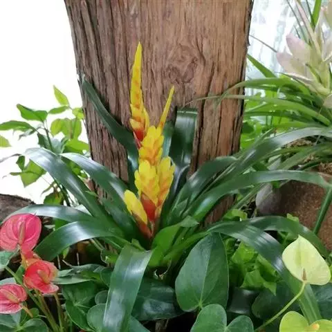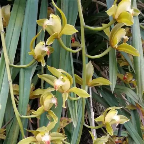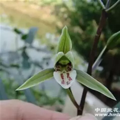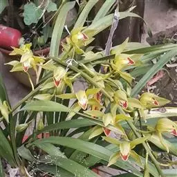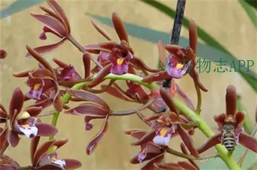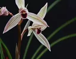 斑舌兰(学名:Cymbidium tigrinum Parish ex Hook.):附生植物;假鳞茎近球形或卵球形,强烈压扁,呈双凸镜状,裸露,不为叶鞘所包。叶通常2-4枚,生于假鳞茎顶端,狭椭圆形。花葶发自假鳞茎基部,长10-20厘米,斜展;总状花序具2-5朵花;花稍有香气;萼片与花瓣黄绿色,略有红褐色晕,基部有紫褐色斑点,唇瓣白色,授粉后变为粉红色;花瓣略短于萼片;唇瓣近倒卵形,3裂。花期3-7月。
