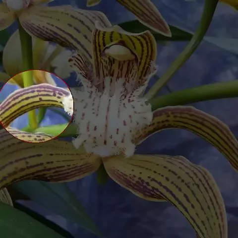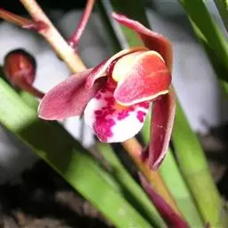 花葶发自假鳞茎基部,长10-20厘米,斜展;总状花序具2-5朵花;花苞片三角形,长4-9毫米;花稍有香气;萼片与花瓣黄绿色,略有红褐色晕,基部有紫褐色斑点,唇瓣白色,授粉后变为粉红色,侧裂片紫褐色,中裂片上有红紫色斑点与短横纹,褶片白色而有紫点,蕊柱绿色,顶端红褐色,下部有紫纹;萼片狭椭圆状披针形,长3.5-4厘米,宽8-12毫米。