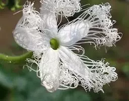 雌雄同株,雌、雄花均单生。雄花:花梗细,比叶柄稍长,花梗、花萼、花冠均被微柔毛;花萼筒漏斗状,长约2厘米,裂片披针形,长5毫米;花冠黄色,裂片皱波状,长3-4厘米,宽2-3厘米,先端微缺而顶端有小尖头,5脉;雄蕊3,花丝长3-4毫米,花药长8-10毫米,长圆形,药室折曲。雌花花梗比叶柄稍短或近等长;花萼和花冠似雄花;花萼筒长2-3毫米;子房中间缢细,密生粘质长柔毛,花柱粗短,柱头3,膨大,2裂。果实初为绿色,后变白色至带黄色。
