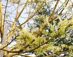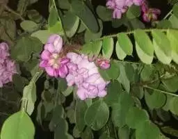 2、翅荚香槐又名:小叶光板朱藤。大乔木,高30米,胸径80-120厘米;树皮暗灰色,多皮孔。一年生枝被褐色柔毛,旋即秃净。奇数羽状复叶;小叶3-4对,互生或近对生,长椭圆形或卵状长圆形,基部的最小,顶生的最大,通常长4-10厘米,宽3-5.5厘米,先端渐尖,基部钝圆或宽楔形,侧生小叶基部稍偏斜,上面无毛,下面近中脉处被疏柔毛或无毛,中脉上面稍凹陷,下面明显隆起,侧脉6-8对,近边缘网结,细脉明显;小叶柄长3-5毫米,密被灰褐色柔毛;小托叶钻状,长达2毫米,无毛。圆锥花序长30厘米,径15厘米;花序轴和花梗被疏短柔毛,花梗细,长3-4毫米;花萼阔钟状,与花梗等长,密枝棕褐色绢毛,萼齿5,三角形,近等长;花冠白色,芳香,旗瓣长圆形,瓣片长6毫米,宽4毫米,柄长约4毫米,先端圆或微凹缺,翼瓣三角状卵形,瓣片长8毫米,宽5毫米,柄长3-4毫米,稍具耳,龙骨瓣卵形,与翼瓣近等长,稍宽,柄纤细,长约4毫米;雄蕊10,离生;子房线形,被淡黄白色疏柔毛,花柱稍弯曲,胚珠5-6粒。荚果扁平,长椭圆形或长圆形,长4-8厘米,宽1.5-2厘米,两侧具翅,不开裂,有种子1-2粒,稀4粒;种子长圆形,长约8毫米,宽3毫米,压扁,种皮深褐色或黑色。花期4-6月,果期7-10月。