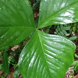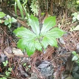 块茎小,近球形,直径1-2厘米。鳞叶2,线状披针形,锐尖,膜质,内面的长9-15厘米。叶1,叶柄长17-30厘米,下部1/3具鞘,紫色;叶片鸟足状分裂,裂片5,倒卵形,倒卵状披针形或椭圆形,先端短渐尖或锐尖,基部楔形,中裂片具长0.2-2厘米的柄,??7-11厘米,宽4-7厘米,侧裂片具长0.5-1厘米共同的柄,与中裂片近等大;侧脉脉距0.8-1.2厘米,集合脉距边缘3-6毫米,全缘。