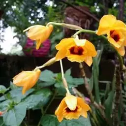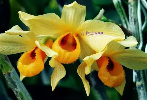杓唇石斛(学名:Dendrobium moschatum (Buch.-Ham.) Sw.):茎粗状,质地较硬,直立,圆柱形,不分枝,具多节。叶革质,二列;互生于茎的上部,长圆形至卵状披针形。总状花序出自去年生具叶或落了叶的茎近端,下垂,长约20厘米,疏生数至10余朵花;花深黄色,白天开放,晚间闭合,质地薄;花瓣斜宽卵形,长2.6-3.5厘米,宽1.7-2.3厘米,先端钝,具7条脉;唇瓣圆形,边缘内卷而形成杓状。花期4-6月。