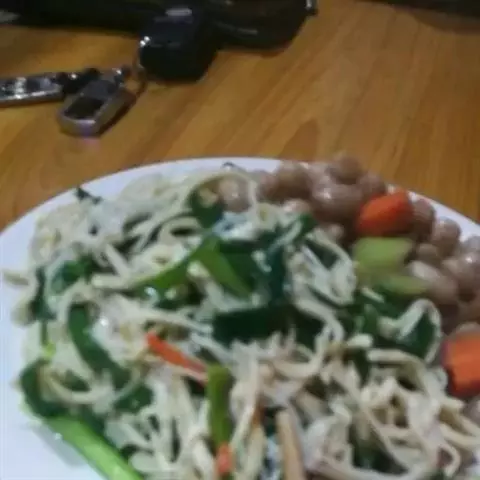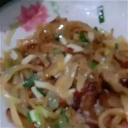 14.在浇上刚才做好的汤菜,在放点肉臊子进去,撒上蒜苗就可以了。