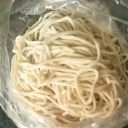 2、在盆里倒些面粉,用刚化开的碱水和面,和出的面粉湿度用手抓一把面,放开后面粉散开为宜,但不可太干,多揉搓些,放置一会儿后,用压面机压或用手擀。最好是到市场去买现成的又薄又细又长的机器压面。