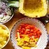 10.在把刚才摊的鸡蛋饼也切成小丁,蒜苗切碎。