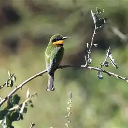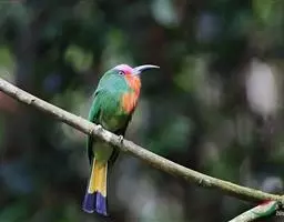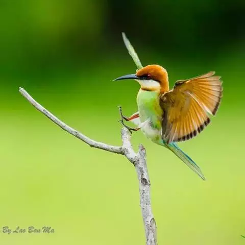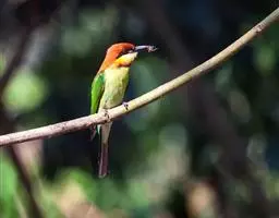 栗喉蜂虎是蜂虎科蜂虎属的鸟类。有热带鸟类羽毛艳丽的特征:喉部是栗红色的,黑色的过眼纹,…