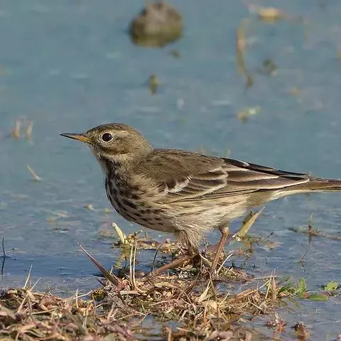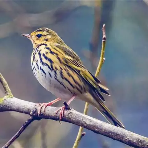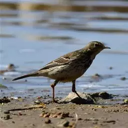 粉红胸鹨(学名:Anthus roseatus):属小型鸣禽,体重18-27克,体长13-18厘米。非繁殖期粉皮黄色的粗眉线明显,背灰而具黑色粗纵纹,胸及两胁具浓密的黑色点斑或纵纹。虹膜暗褐色;嘴黑褐色;下嘴基部色较淡,呈角褐色;跗蹠和趾褐色。上喙较细长,先端具缺刻;翅尖长,内侧飞羽(三级飞羽)极长,几与翅尖平齐;尾细长,外侧尾羽具白,野外停栖时,常做有规律的上、下摆动,腿细长,后趾具长爪,适于在地面行走。