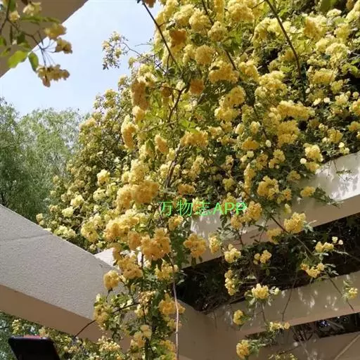 黄木香花(学名:Rosa banksiae Ait. form. lutea (Lindl.) Rehd.)是攀援小灌木,高可达6米;小枝圆柱形,无毛,有短小皮刺;叶3-5,叶片椭圆状卵形或长圆披针形,花小形,多朵成伞形花序,萼片卵形,花黄色重瓣,无香味,倒卵形,花期4-5月。花朵较多,花期较长。产自中国江苏。