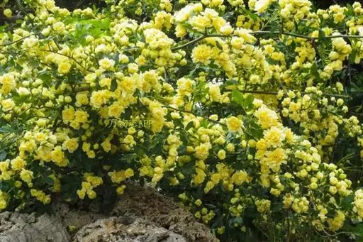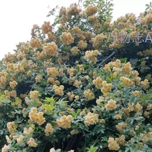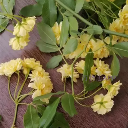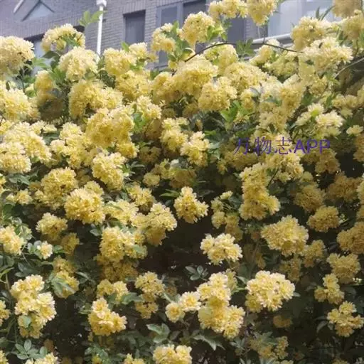 黄木香花 攀援小灌木,高可达6米;小枝圆柱形,无毛,有短小皮刺;老枝上的皮刺较大,坚硬,经栽培后有时枝条无刺。小叶3-5,稀7,连叶柄长4-6厘米;小叶片椭圆状卵形或长圆披针形,长2-5厘米,宽8-18毫米,先端急尖或稍钝,基部近圆形或宽楔形,边缘有紧贴细锯齿,上面无毛,深绿色,下面淡绿色,中脉突起,沿脉有柔毛;小叶柄和叶轴有稀疏柔毛和散生小皮刺;托叶线状披针形,膜质,离生,早落。花小形,多朵成伞形花序,花直径1.5-2.5厘米;花梗长2-3厘米,无毛;萼片卵形,先端长渐尖,全缘,萼筒和萼片外面均无毛,内面被白色柔毛;花黄色重瓣,倒卵形,先端圆,基部楔形;心皮多数,花柱离生,密被柔毛,比雄蕊短很多。花期4-5月。