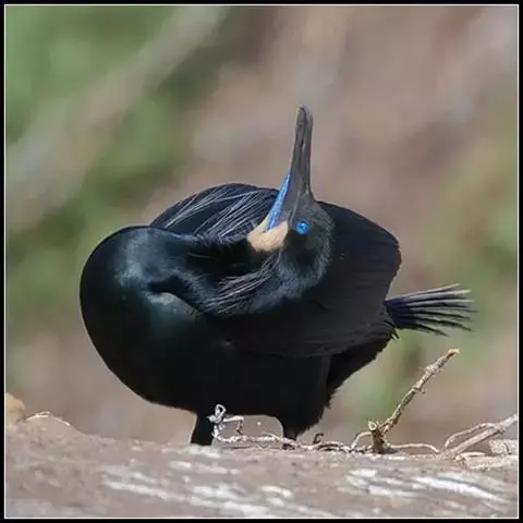 双冠鸬鹚是一种海洋性水鸟,体长 74-91厘米,双翼展开宽132-137厘米,体重1.7–2.1千克。全身乌黑发亮的羽毛泛出绿色光泽;灰色的翅膀是鳞片状黑褐色羽毛;有一长尾巴;最显着特征是嘴角处裸露的桔红色皮肤分外鲜明。繁殖期头上长出两簇柱状的冠羽。