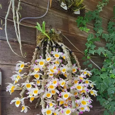 黑毛石斛(学名:Dendrobium williamsonii Day et Rchb. f.):茎圆柱形,有时肿大呈纺锤形,不分枝,具数节。叶数枚,通常互生于茎的上部,革质,长圆形。总状花序出自具叶的茎端,具1-2朵花;花开展,萼片和花瓣淡黄色或白色,相似,近等大,狭卵状长圆形,长2.5-3.4厘米,宽6-9毫米,先端渐尖,具5条脉;唇瓣淡黄色或白色,带橘红色的唇盘,长约2.5厘米,3裂。花期4-5月。