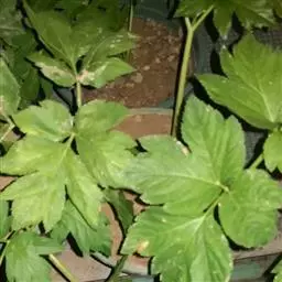 【植株受冻】 西芹不耐严寒,当气温在0℃或0℃以下易出现受冻症状。当植株严重受冻时,叶柄组织结构遭到破坏,在气温回升后,组织不能恢复,细胞间隙增大,从而出现空心。所以,在栽培过程中要防止受冻,应采用保温措施,避免露地越冬。