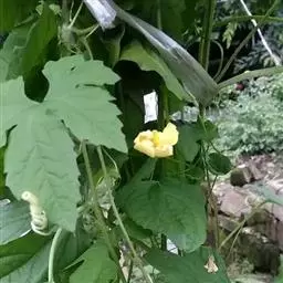 木鳖子(学名:Momordica cochinchinensis (Lour.) Spreng.),别称:番木鳖(中国经济植物志),糯饭果(云南河口),老鼠拉冬瓜等。多年生草质藤木,具膨大的块状根。茎有纵棱;卷须粗壮,与叶对生,单一,不分枝。叶互生,圆形至阔卵形,长7-14厘米,通常3浅裂或深裂,裂片略呈卵形或长卵形,全缘或具微齿,基部近心形,先端急尖,上面光滑,下面密生小乳突,3出掌状网脉;叶柄长5-10厘米,具纵棱,在中部或近叶片处具2-5腺体。花单性,雌雄同株。常生于海拔450-1100米的山沟、林缘及路旁。野生于山坡、林缘的土层深厚处。喜温暖和充足阳光。在过阴环境下生长不良。分布于分布于长江流域及以南地区,中南半岛和印度半岛也有。有消肿散结,祛毒的功效。