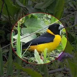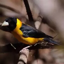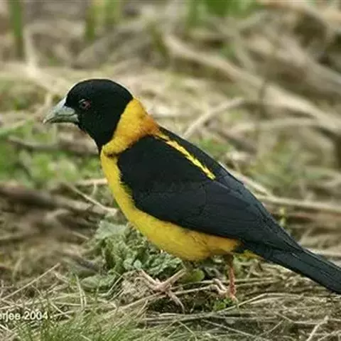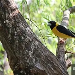 黄颈拟蜡嘴雀:小型鸟类,体长20-22厘米。嘴粗大,黑色。雄鸟整个头、颈、颏、喉和上胸辉黑色,…
