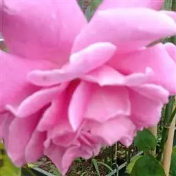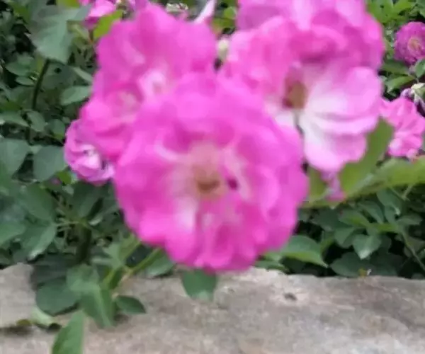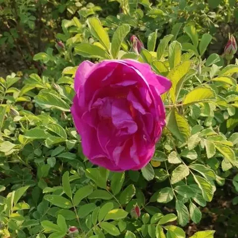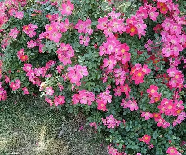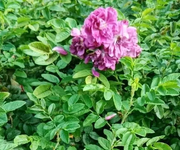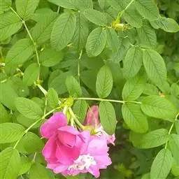 直立灌木,高可达2米;茎粗壮,丛生;小枝密被绒毛,并有针刺和腺毛,有直立或弯曲、淡黄色的皮刺,皮刺外被绒毛。小叶5-9,连叶柄长5-13厘米;小叶片椭圆形或椭圆状倒卵形,长1.5-4.5厘米,宽1-2.5厘米,先端急尖或圆钝,基部圆形或宽楔形,边缘有尖锐锯齿,上面深绿色,无毛,叶脉下陷,有褶皱,下面灰绿色,中脉突起,网脉明显,密被绒毛和腺毛,有时腺毛不明显;叶柄和叶轴密被绒毛和腺毛;托叶大部贴生于叶柄,离生部分卵形,边缘有带腺锯齿,下面被绒毛。花单生于叶腋,或数朵簇生,苞片卵形,边缘有腺毛,外被绒毛;花梗长5 -22.5毫米,密被绒毛和腺毛;花直径4-5.5厘米;萼片卵状披针形,先端尾状渐尖,常有羽状裂片而扩展成叶状,上面有稀疏柔毛,下面密被柔毛和腺毛;花瓣倒卵形,重瓣至半重瓣,芳香,紫红色至白色;花柱离生,被毛,稍伸出萼筒口外,比雄蕊短很多。果扁球形,直径2-2.5厘米,砖红色,肉质,平滑,萼片宿存。花期5-6月,果期8-9月。 粉玫瑰