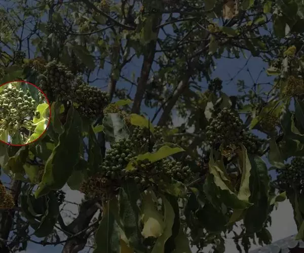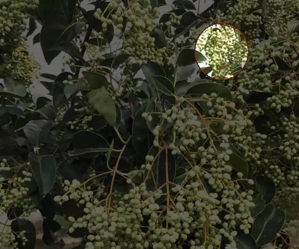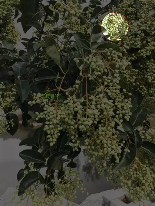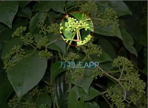伞房状圆锥花序,顶生,长3-8厘米;花小而多,青色,单性,萼片及花瓣均5片;花瓣淡黄白色,长约2毫米。雌花有心皮3-5个。
