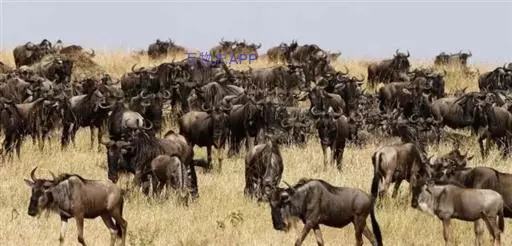 角马生活在非洲广阔的草原上。雨季期间,雨水充足,角马栖息在广阔的草原上。但到了旱季,为了寻找新鲜的草料,非洲角马不得不离开这里,它们聚集起来,数量多达150万头,成群结队地去寻找食物,每天要走48公里。