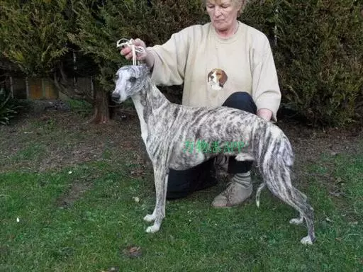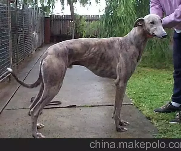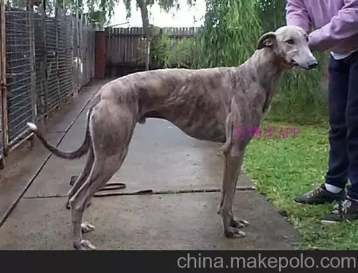 细长的头部,头顶平坦,朝鼻尖逐渐变细。小而薄的耳朵向下折叠,呈玫瑰状。暗色的眼睛呈椭圆形,两眼间距分得较开。放光的眼神中显示出不平凡的机敏。胸部厚实,背部肌肉结实,腰部强壮。尾巴长,尾端细,略微弯曲。前腿笔直,两腿之间的距离不是很大,后肢脚大,大腿肌肉非常发达。脚尖宽,肉趾厚实 .