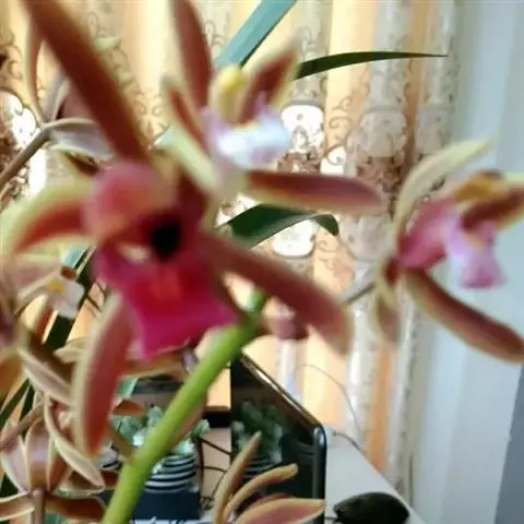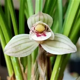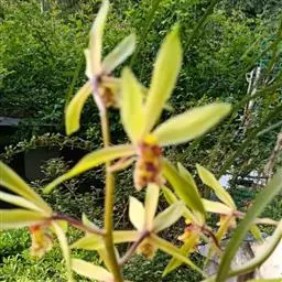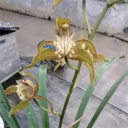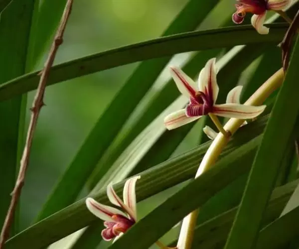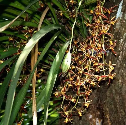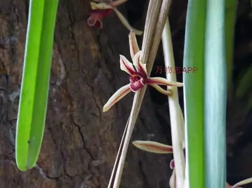 纹瓣兰 花葶从假鳞茎基部穿鞘而出,下垂,长20-60厘米;总状花序具(15-)20-35朵花;花苞片长2-5毫米;花梗和子房长1.2-2厘米;花略小,稍有香气;萼片与花瓣淡黄色至奶油黄色,中央有1条栗褐色宽带和若干条纹,唇瓣白色或奶油黄色而密生栗褐色纵纹;萼片狭长圆形至狭椭圆形,长1.5-2厘米,宽4-6毫米;