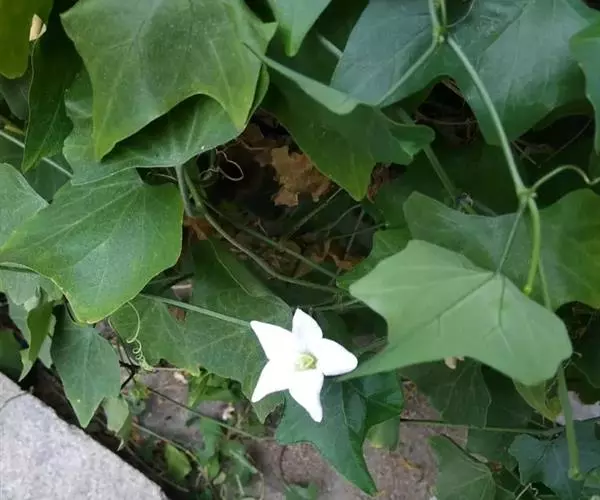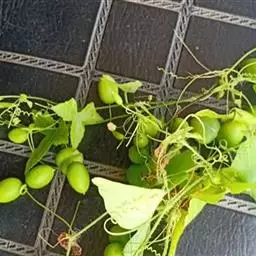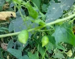 叶柄细,有纵条纹,长2-5厘米;叶片阔心形,长、宽均5-10厘米,常有5个角或稀近5中裂,两面布有颗粒状小凸点,先端钝圆,基部有数个腺体,腺体在叶背明显,呈穴状,弯缺近圆形,深和宽均1-2厘米。卷须纤细,无毛,不分歧。
