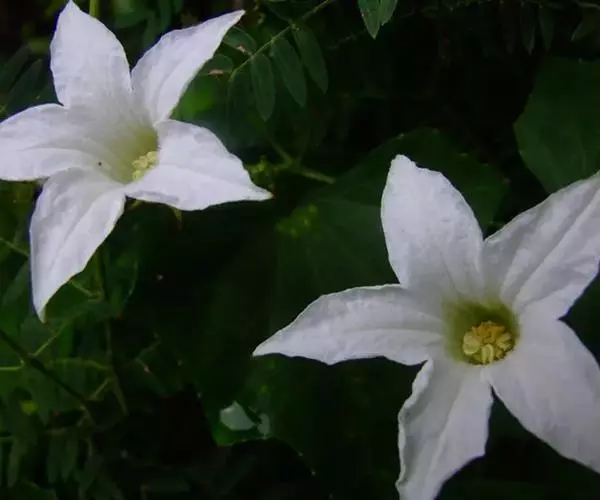 雌雄异株;雌花、雄花均单生。雄花花梗细弱,长2-4厘米,光滑无毛;花萼筒宽钟形,长、宽均4-5毫米,裂片线状披针形,长3毫米;花冠白色或稍带黄色,长2.5-3.5厘米,5中裂,裂片卵形,外面无毛,内面有柔毛;雄蕊3,花丝及花药合生,花丝长2-3毫米,花药近球形,长6-7毫米,药室折曲。雌花梗纤细,长1-3厘米;退化雄蕊3,长1-3毫米,近钻形,基部有短的长柔毛;子房纺锤形,长12-15毫米,厚3-4毫米,花柱纤细,长6-7毫米,无毛,柱头3,长5-6毫米。