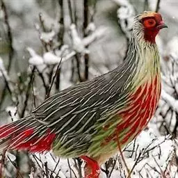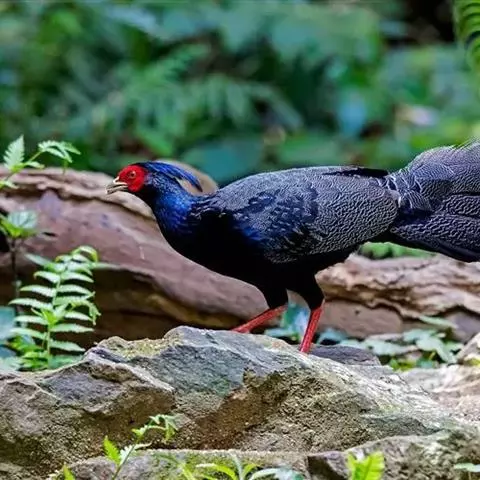 血雉雉科血雉属鸟类,别名血鸡、松花鸡,血雉的雄鸟大覆羽、尾下覆羽、尾上覆羽、脚、头侧、腊膜为红色,…