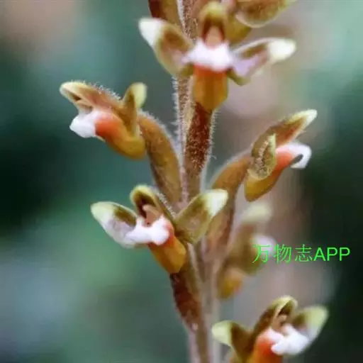 总状花序顶生,具多数密生的花,长5-10厘米;花苞片披针形,带红褐色,长10-12毫米,宽约4毫米,先端渐尖,背面被短柔毛;子房圆柱形,红褐色,扭转,被短柔毛,连花梗长9-10毫米;花较小,萼片带红褐色或褐绿色,背面被短柔毛,中萼片直立,凹陷,长椭圆形,长4-6毫米,宽1.5-2.5毫米,先端稍钝;侧萼片张开,偏斜的椭圆形或卵状椭圆形,长5.5-6毫米,宽3毫米,先端急尖或稍钝。