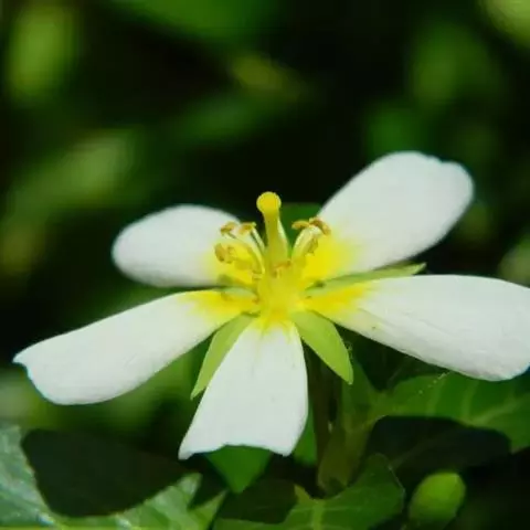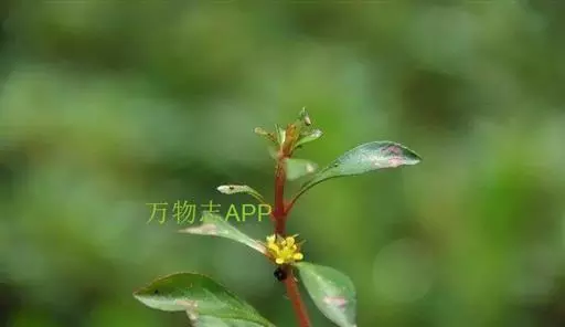 多年生匍匐草本,近无毛,节上生根;茎长达50厘米,茎枝顶端上升。叶卵形至椭圆形,长1-2.2厘米,宽0.5-1.5厘米,先端锐尖,基部骤狭成具翅的柄,侧脉4-7对,无毛;叶柄长2-7毫米。花单生于茎枝上部叶腋,几乎无梗;小苞片2,生花基部;卵状长圆形,长约1.8毫米,宽约0.4毫米;萼片4,卵状三角形,长2-3毫米,宽1-2毫米,先端锐尖,边缘有微毛;花瓣不存在;雄蕊4;花丝长0.5-0.8毫米;花药淡黄色,近基着生,近球形,长0.6-0.9毫米,花粉粒以单体授粉;花盘隆起,绿色,深4裂,无毛,裂片对瓣;花柱绿色,长0.6-1毫米,无毛;柱头绿色,头状,径0.3-0.5毫米。