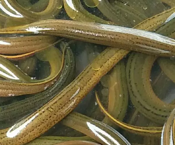 体细长,呈蛇形,向后渐侧扁,尾部尖细。头圆,吻端尖,唇颇发达,下唇尤其肥厚。上下颌及腭骨上部有细齿。眼小,为一薄腊所覆盖。两个鼻孔分离较远,后鼻孔在眼前缘的上方,前鼻孔在吻部。左右鳃孔在腹联合为一,呈“V”字形。体无鳞。无胸腹鳍,背、臀鳍退化仅留低皮褶,无软刺,都与尾鳍相联合。体色微黄或橙黄,全体满布黑色小点,腹部灰白。
