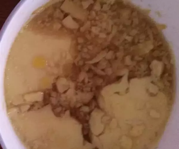 2. 加入两倍于蛋液的温水,搅拌均匀,滤出蛋液上浮着的泡面,最后盖上盖子放入蒸锅中。