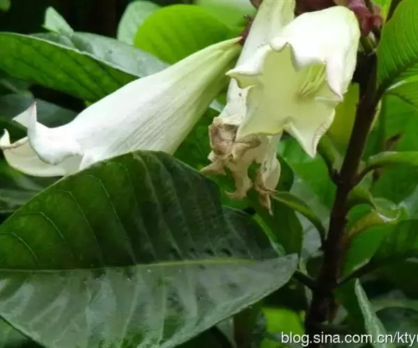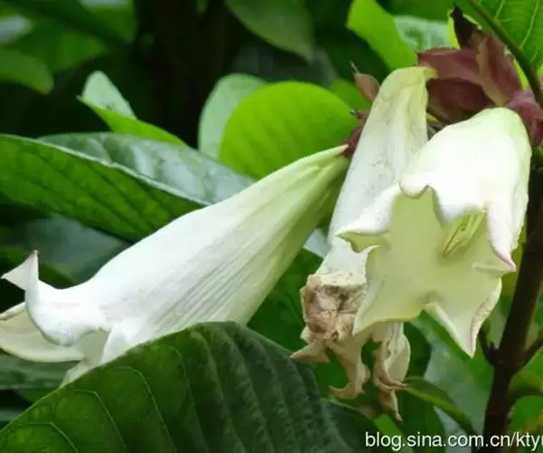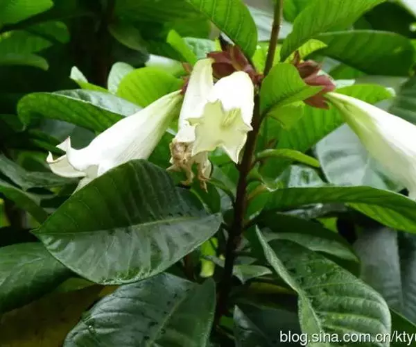 聚伞花序顶生,着花3-5朵,有时更多;花梗有锈色柔毛,长2-4厘米;花萼裂片长圆状披针形或倒卵形,或倒披针形,长2.5-4厘米;花冠长约10厘米,外面有微毛,裂片卵圆形;雄蕊着生于花冠筒的喉部,花药箭头状。