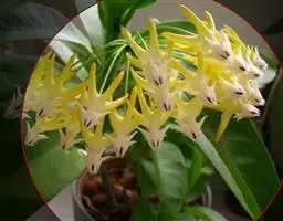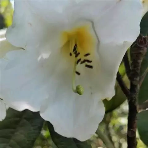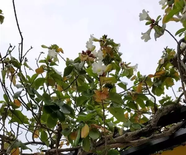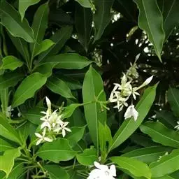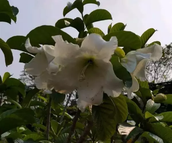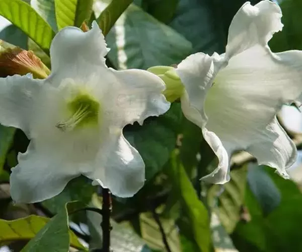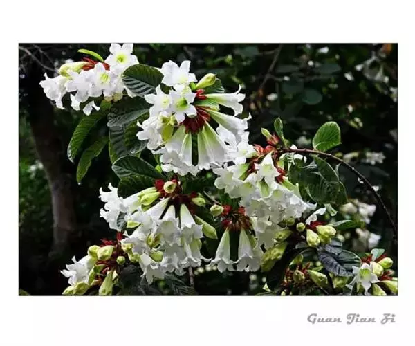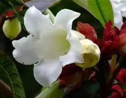 清明花为常绿木质大藤本,具乳汁,茎有皮孔;卵形叶对生,先端锐尖,有小毛,侧脉明显;聚伞花序顶生,着花3—5朵,有时更多;花大,漏斗形,白色,有香气,花冠5裂片;蓇葖果形状多变,内果皮亮黄色,种子有白色绢质种毛。果期秋冬季。根、叶供药用,可治风湿性腰腿痛、跌打损伤等。
