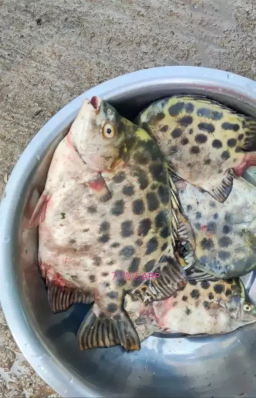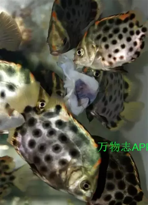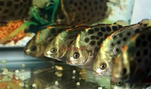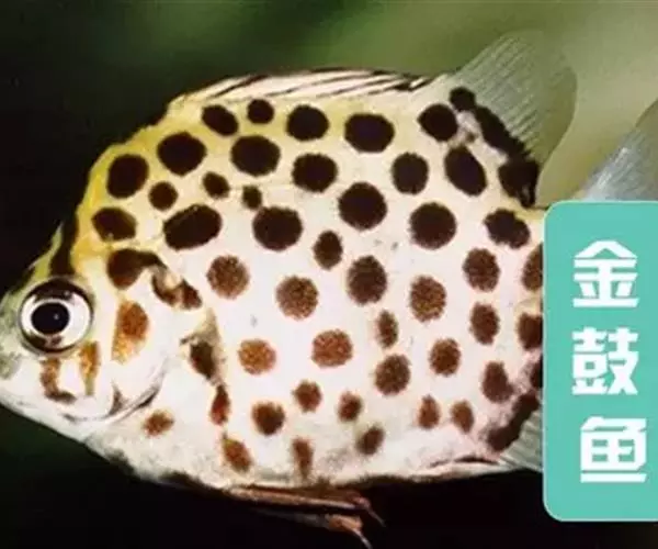 ①红金鼓鱼(饰纹金钱鱼,Scatophagus ornatus):鱼体黄红色,布以黑色圆斑,背鳍后部、臀鳍后部和尾鳍均为银白色。