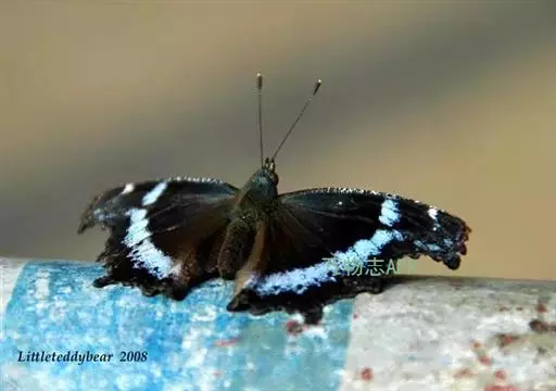 琉璃蛱蝶 Kaniska canace (Linnaeus,1763),蛱蝶科琉璃蛱蝶属,全世界记载的只一种,广布于亚州古北区及东洋区。中型蛱蝶,翅表黑色,在亚外缘有一蓝紫色宽带纵贯前后翅,此带在前翅端分断为两点,外横线至亚外缘间翅色较淡;雌雄色彩斑纹相似,但翅表蓝色带点宽圆,翅型较大,翅之腹面横脉外缘的白色斑点亦大。幼虫摄食菝契科的各种菝契;成虫出没于三至十二月,飞行迅速,有领域性,喜访花及吸食树液、动物粪便。