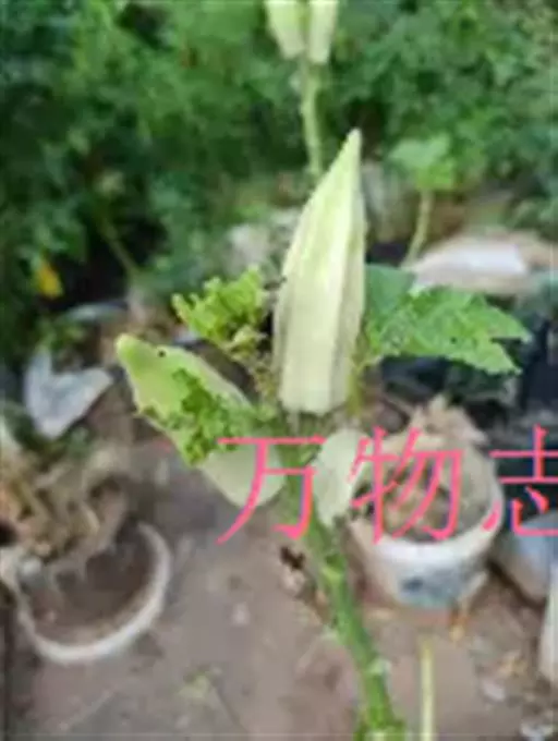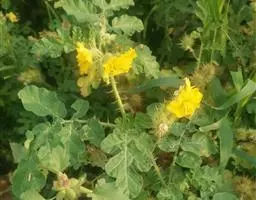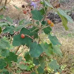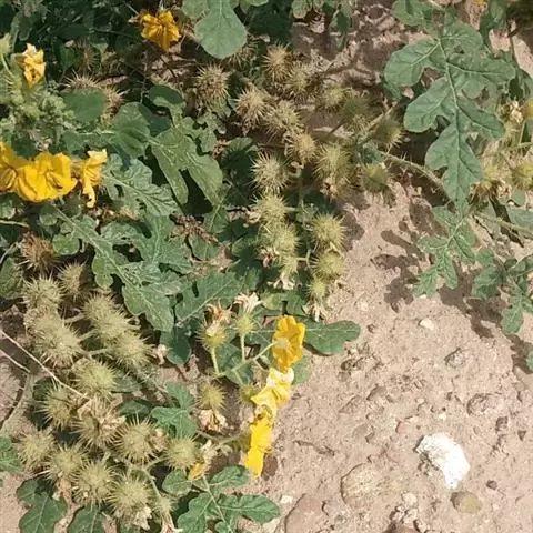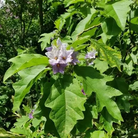 直立草本至亚灌木,高1-1.5m。叶、花序及果实均密被黄色具节的长硬毛及不相等分枝的星状硬毛及直刺。小枝尘土色,多被具短柄的星状毛及长2-5mm直刺;叶柄长3-5cm,多被具长柄的星状毛及直刺;叶片大而厚,卵形,长10-20cm,宽8-18cm,先端短尖,基部楔形,边缘有5-11个三角形波状浅裂,毛被在上面较薄,多被长硬毛及无柄不相等分枝的星状毛,在下面略厚,多被具短柄的星状毛,中脉上面微凹,下面微凸,侧脉约与裂片同数,其上在两面均着生稀疏的细直刺。蝎尾状花序腋外生;萼杯状,直径约1.5cm,外面密被具短柄及长柄的星状毛,先端5裂,裂片卵状披针形;花冠白色,近辐形,筒部隐于萼内,先端5裂,裂片卵状披针形,外面具星状毛;雄蕊5,花药先端延长,卵状渐尖,顶孔向上;子房近卵形,柱头截形。浆果球状,直径约2cm,外面密被黄土色星状硬毛;种子扁平,黑褐色,直径约2mm。花期夏、秋季,果熟期冬季。