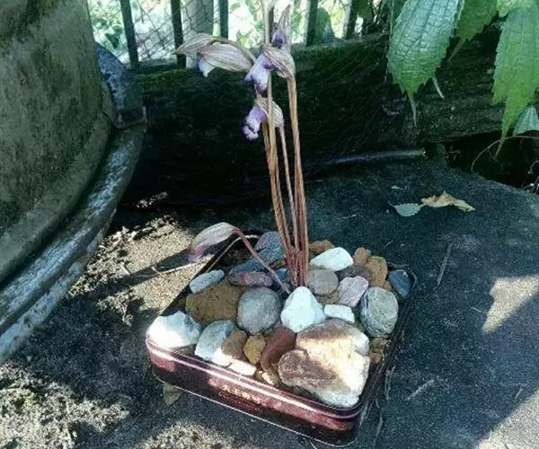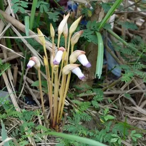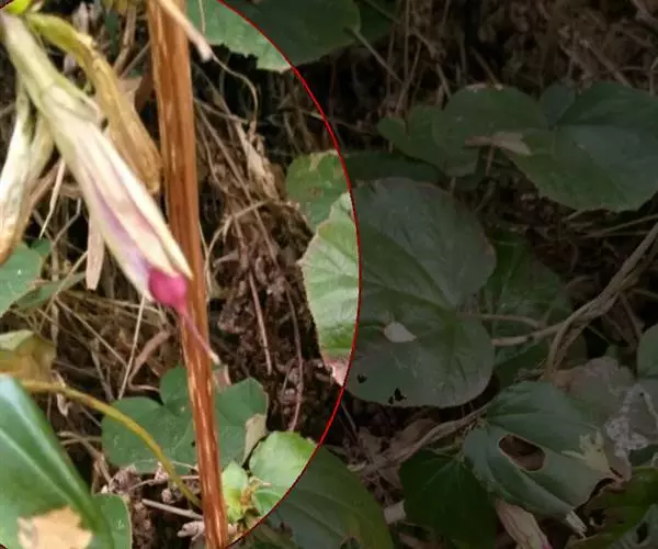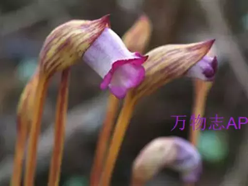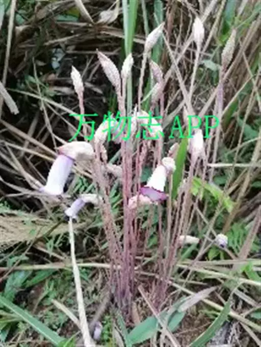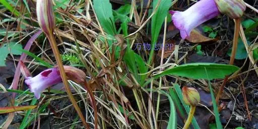 一年生寄生草本,高15-40(-50)厘米。根稍肉质,具树状细小分枝。茎黄褐色或紫红色,不分枝或自近基部处有分枝,偶尔自中部以上分枝。叶肉红色,卵状披针形或披针形,长5-10毫米,宽3-4毫米,两面乡七滑无毛。花常单生茎端,稍俯垂。花梗粗壮,常直立,长10-30(-40)厘米,直径约3毫米,无毛,常具紫红色的条纹。花萼一侧裂开至近基部,长2.5-4.5(-6.5)厘米,紫红色、黄色或黄白色,具紫红色条纹,先端急尖或渐尖,两面无毛。花冠带粘液,常与花萼同色,或有时下部白色,上部带紫色,凋谢后变绿黑色,干时变黑色,长4-6厘米,不明显的二唇形,筒部宽,稍弯曲,在花丝着生处变窄,顶端5浅裂,上唇裂片和下唇的侧裂片较短,近圆形,全缘,下唇中间裂片稍大。雄蕊4枚,内藏,花丝着生于距筒基部1.4-1.5厘米处,长7-9毫米,紫色,无毛,花药黄色,有粘液,成对粘合,仅1室发育,下方一对雄蕊的药隔基部延长成距。子房1室,侧膜胎座4个,横切面有极多分枝,花柱无毛,长1-1.5厘米,柱头膨大,肉质,淡黄色,盾状。蒴果圆锥状或长卵球形,长约2-3厘米,2瓣开裂。种子多数,细小,椭圆形,黄色,长约0.04毫米,种皮网状。花期4-8月,果期8-10月。