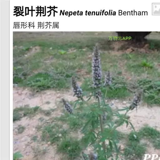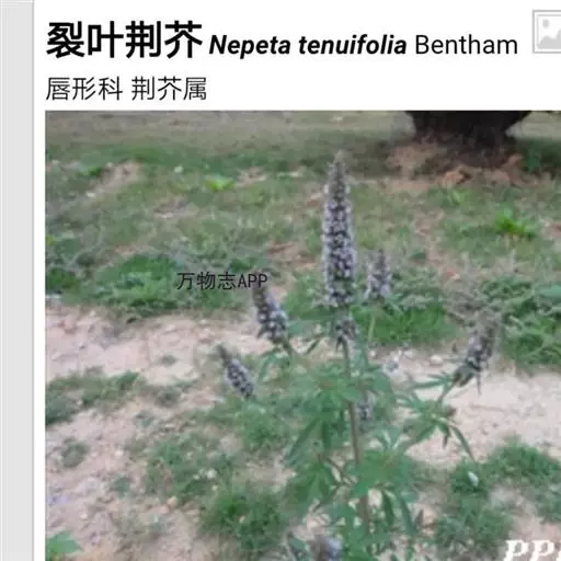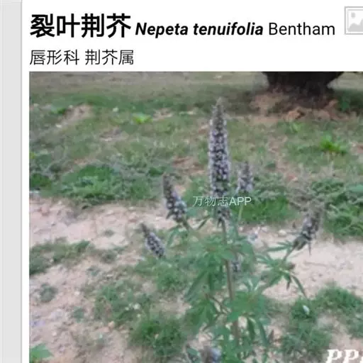 裂叶荆芥(学名:Nepeta tenuifolia Benth.)是唇形科裂叶荆芥属植物。一年生草本,一年生草本。茎高0.3-1米,四棱形,多分枝,被灰白色疏短柔毛,茎下部的节及小枝基部通常微红色。叶通常为指状三裂,大小不等,长1-3.5厘米,宽1.5-2.5厘米。花序为多数轮伞花序组成的顶生穗状花序,长2-13厘米。小坚果长圆状三棱形,长约1.5毫米,径约0.7毫米,褐色,有小点。花期7-9月,果期在9月以后。