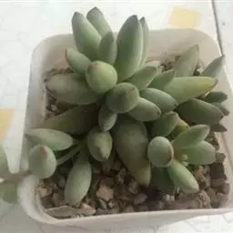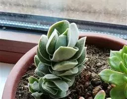肉质叶排列成标准的莲座状生于短缩茎上,倒卵匙形,被白粉。生长旺盛时其叶盘直径可达20厘米, 叶片匙形, 稍厚, 顶端有小尖。
