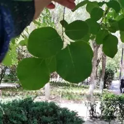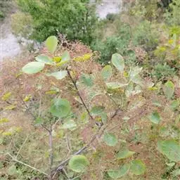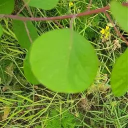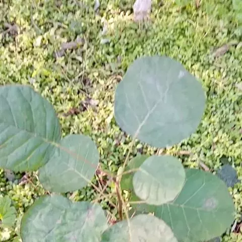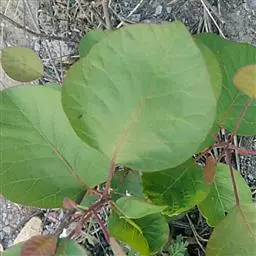 粉背黄栌叶卵圆形,较大,长3.5-10厘米,宽2.5-7.5厘米,无毛,但叶背显著被白粉;叶柄较长,…