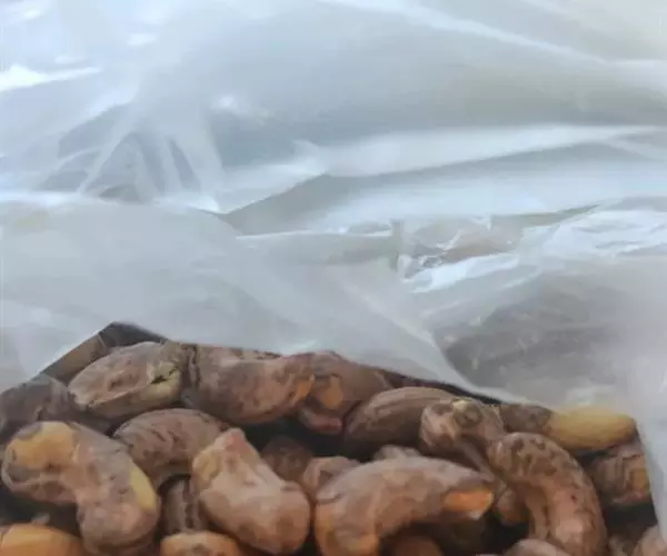 真果是著生在假果顶端的肾形坚果,长约25毫米,由青灰色至黄褐色,果壳坚硬,里面包著种仁,这才是我们常说的“腰果”。所含之脂肪多为不饱和脂肪酸,其中油酸占总脂肪酸的67.4%,亚油酸占19.8%,是高血脂、冠心病患者的食疗佳果。
