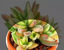 海琳娜叶蓝绿色、长匙形,前端较圆,急尖,呈莲花状紧密排列。秋冬出状态的时候,叶片会变得粉黄至粉红多充色泽,叶缘有点粉色透明感,呈包裹状态,非常冻人。海琳娜叶片比较厚,秋季温差大,或者光照充足的时候整体呈现粉灰色。海琳娜春末开花,小花钟形,橘红色。