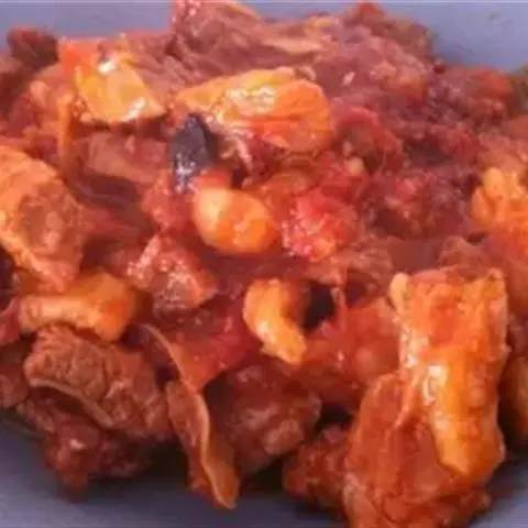 (3)烧热油3大匙,爆香蒜茸,下咖喱酱及糖1小匙炒香,倒入牛肉,爆透后加水盖过牛肉,煮滚后转慢火,炖至筷子可以插入牛肉时即可放余下的调味料,继续炖至牛肉够烂时,加入土豆再炖片刻,最后加入洋葱即成。