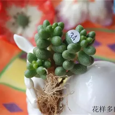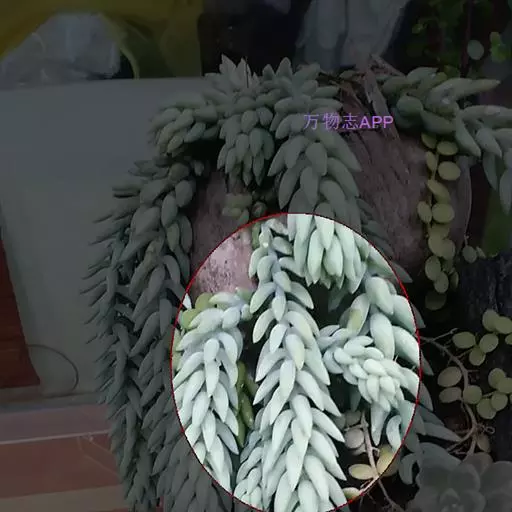 玉缀群生 玉缀 Sedum morganianum 名字起源于日本,日本考古学家在挖掘古坟时,发现一些由玉或玛瑙等宝石制成的玉饰,这些玉饰的造型弯曲如勾,所以便称为“勾玉”,这在日本漫画、小说中相当常见。后来多肉植物界引进玉缀时,观察她叶片的形状很像勾玉,而整串的叶片犹如成串的勾玉,所以这植物便命名为玉つづり,つづり日文就是“缀”,缀玉成串的多肉植物便是“玉缀”,很好听且达意的名字。当然引申意思也可以称为“玉串”或“玉帘”,因此玉缀的别名也有玉帘、玉串、玉珠帘。