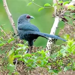 绿嘴地鹃:体形似小鸦鹃,但羽色大致绿灰;嘴绿色,头侧眼的周围有一裸区;后爪弯曲。虹膜赤红色,…