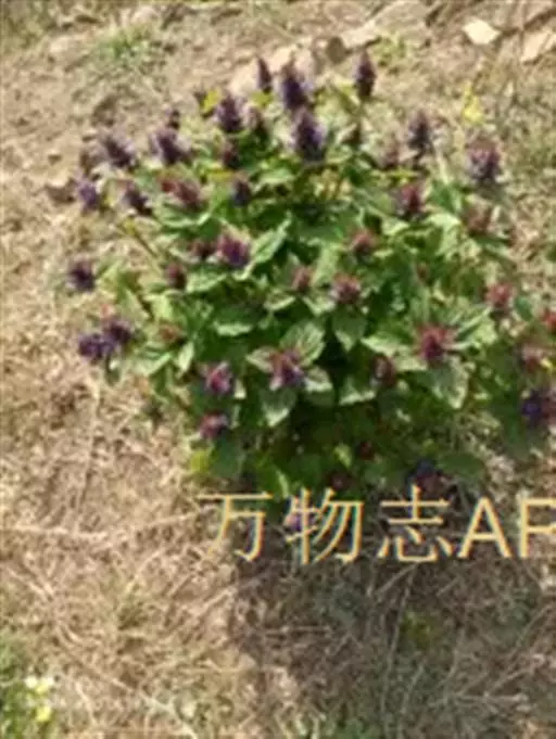穗状花序顶生,偏向一侧,长3.5-4.5厘米,由多数轮伞花序所组成;苞片近圆形或宽卵圆形,长约5毫米,宽6-7毫米,先端具尾状骤尖,尖头长1-1.5毫米,除边缘被小缘毛外余部无毛,极疏生腺点,染紫色;花梗长不及1毫米,近无毛,序轴被短柔毛。花萼钟形,长2-2.5毫米,外面被白色短硬毛,具腺点,萼齿5,三角形,近相等,先端刺芒尖头,边缘具缘毛。花冠玫瑰红紫色,长6-7毫米,微内弯,近漏斗形,外面密被柔毛,内面有毛环,冠筒基部宽约0.5毫米,向上渐宽,至喉部宽不及2毫米,冠檐二唇形,上唇直立,先端微缺,下唇开展,3裂,中裂片圆形,全缘,侧裂片截形或近圆形。雄蕊4,前对较长,均伸出,花丝无毛。花柱超出雄蕊,先端近相等2浅裂,裂片钻形。小坚果长圆形,长1.5毫米,黑棕色,具小疣。花、果期9-11月。