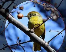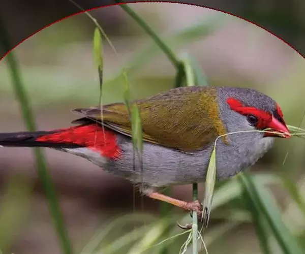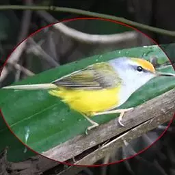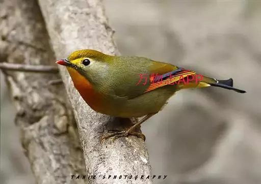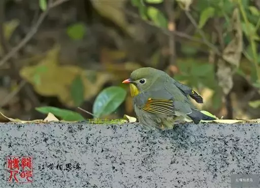 鉴别特征:体形大小似银耳相思鸟,上体从头以至尾上覆羽均为暗灰绿色,头顶绿色较浓;两翅具朱红色翼斑;颏至喉黄色;胸部橙黄;腹部淡白;尾下覆羽浅黄色 。