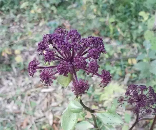 复伞形花序顶生和侧生,花序梗长3-8厘米,有柔毛;伞辐10-22,长2-4厘米;总苞片1-3,卵圆形,阔鞘状,宿存,反折,紫色;小总苞片3-8,线形至披针形,绿色或紫色,无毛;伞辐及花柄有毛;花深紫色,萼齿明显,线状锥形或三角状锥形,花瓣倒卵形或椭圆状披针形,顶端通常不内折成凹头状,花药暗紫色。果实长圆形至卵状圆形,长4-7毫米,宽3-5毫米,无毛,背棱线形隆起,尖锐,侧棱有较厚的狭翅,与果体近等宽,棱槽内有油管1-3,合生面油管4-6,胚乳腹面稍凹入。花期8-9月,果期9-11月。